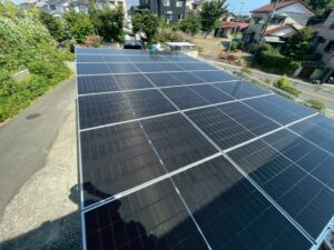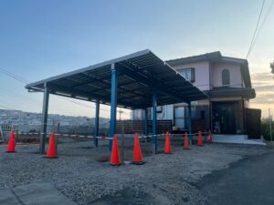 神奈川県平塚市にて、日栄インテック製ソーラーカーポート「E-port V60(3台用)」を採用し、駐車場上部に太陽光パネル21枚・合計9.14kWを設置しました。